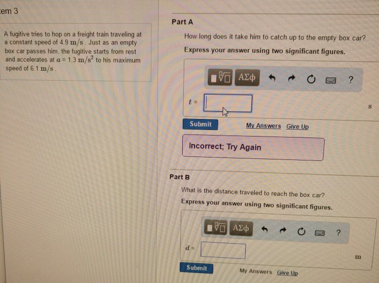 Just as an empty box car passes him the fugitive starts from rest and accelerates at 14 ms to his maximum speed of 60 ms which he then maintains. A fugitive tries to hop on a freight train traveling at a constant speed of 50 ms. A fugitive tries to hop a freight train traveling at a constant speed Of 45 ms.